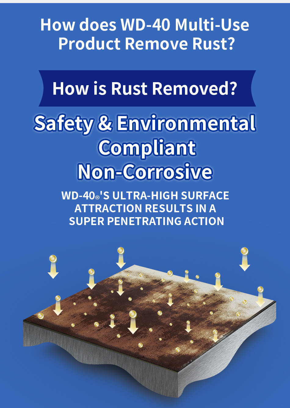 WD-40® Multi-Use Product protects metal from rust and corrosion, penetrates stuck parts, displaces moisture and lubricates almost anything. It even removes grease, grime and more from most surfaces.